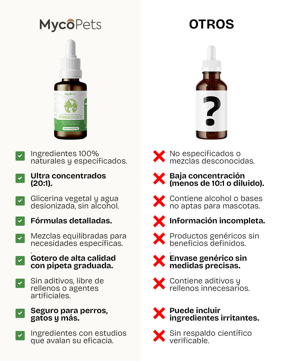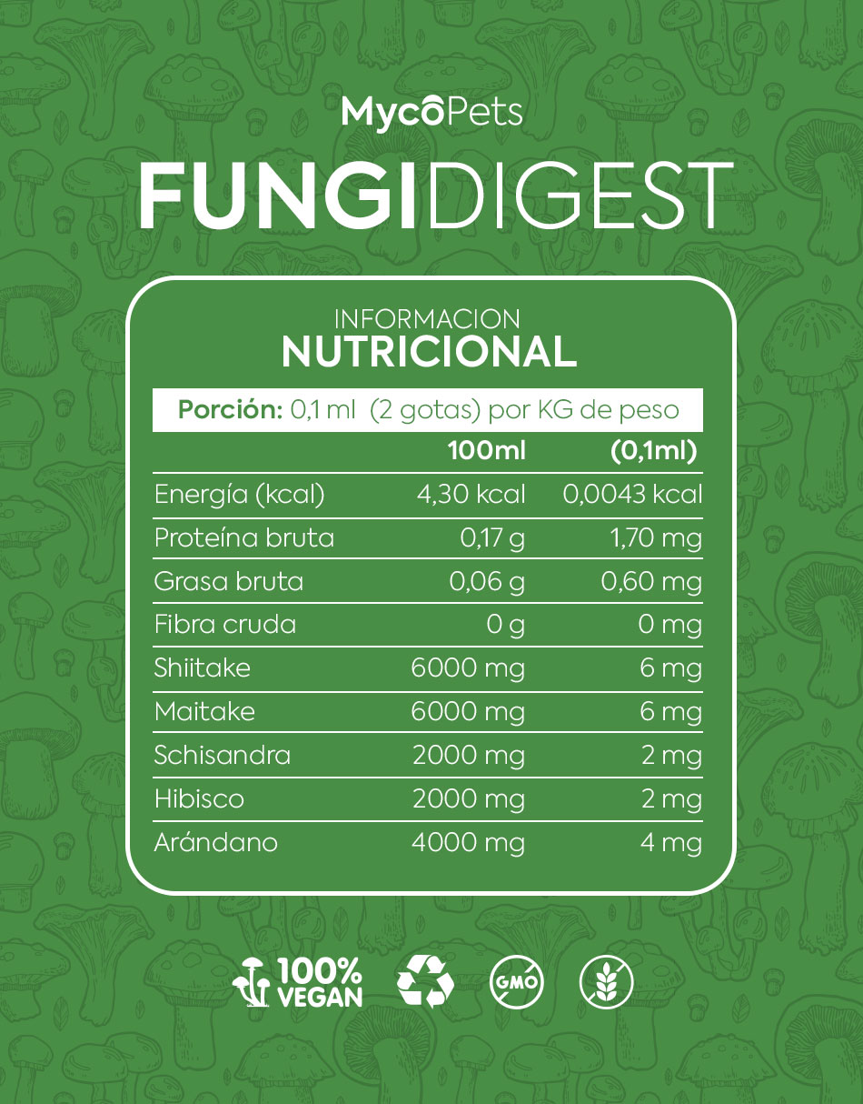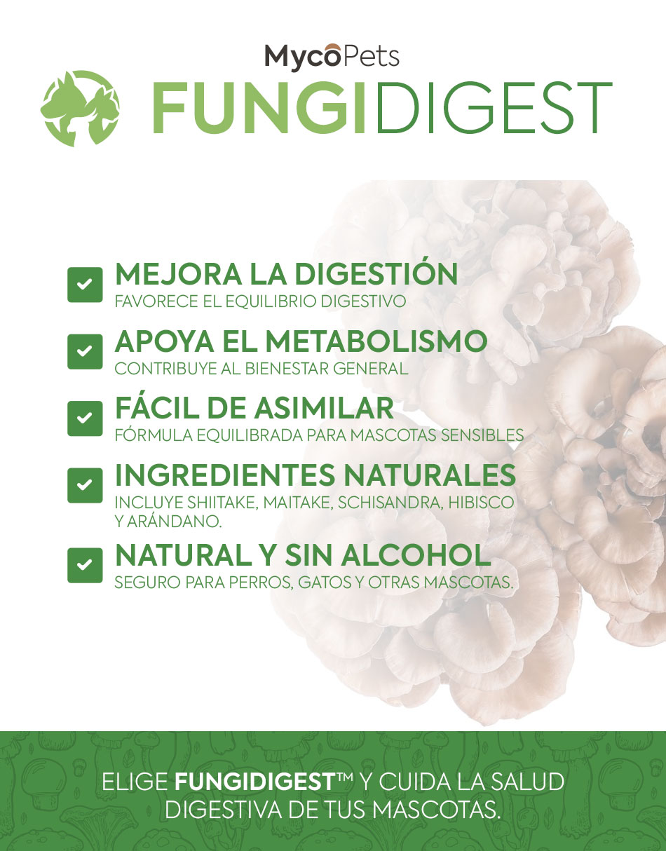 Fungi Digest™ es un suplemento para equilibrio digestivo y metabolismo en mascotas que combina ingredientes naturales diseñados para favorecer la digestión y mejorar el bienestar metabólico. Su fórmula incluye Shiitake, Maitake, Schisandra, Hibiscus y Blueberry, seleccionados por sus beneficios digestivos y antioxidantes.