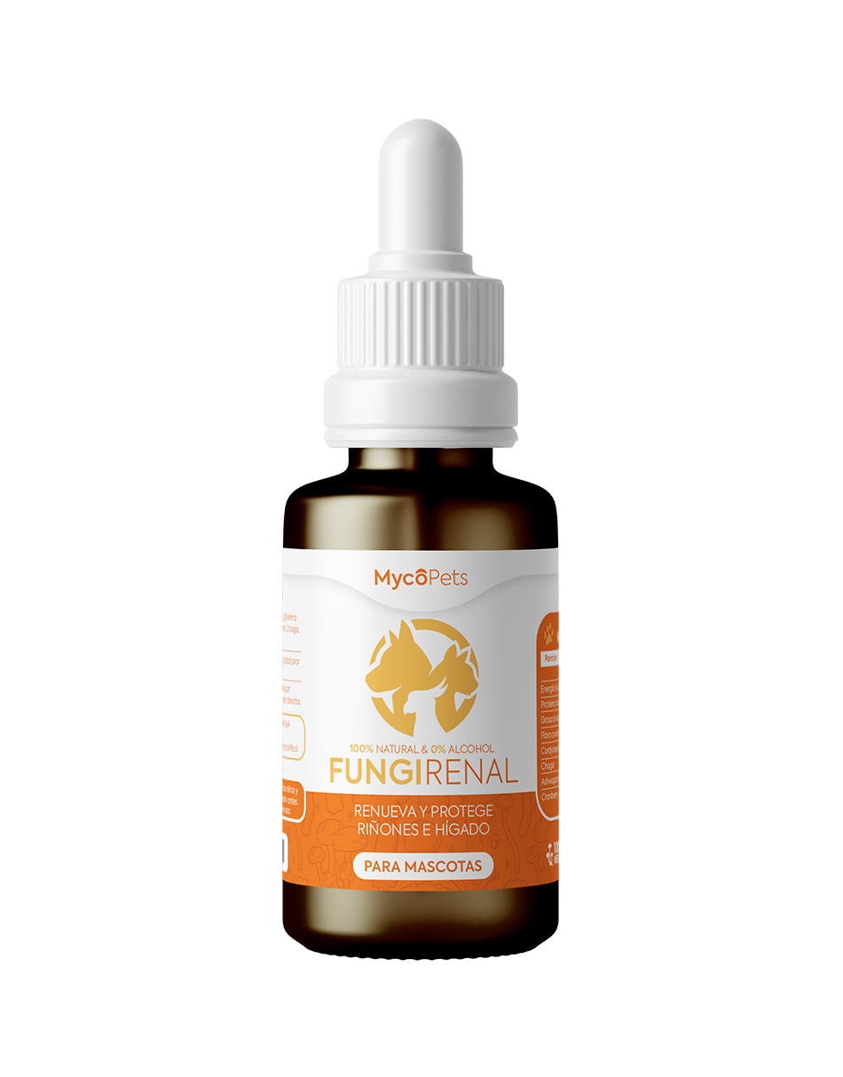 «Fungi Renal™ es un suplemento para apoyo renal y hepático para perros y gatos, elaborado con ingredientes naturales que protegen y renuevan la salud de órganos vitales. Contiene Cordyceps Militaris, Chaga, Ashwagandha y Cranberry, seleccionados por sus propiedades regeneradoras y antioxidantes.